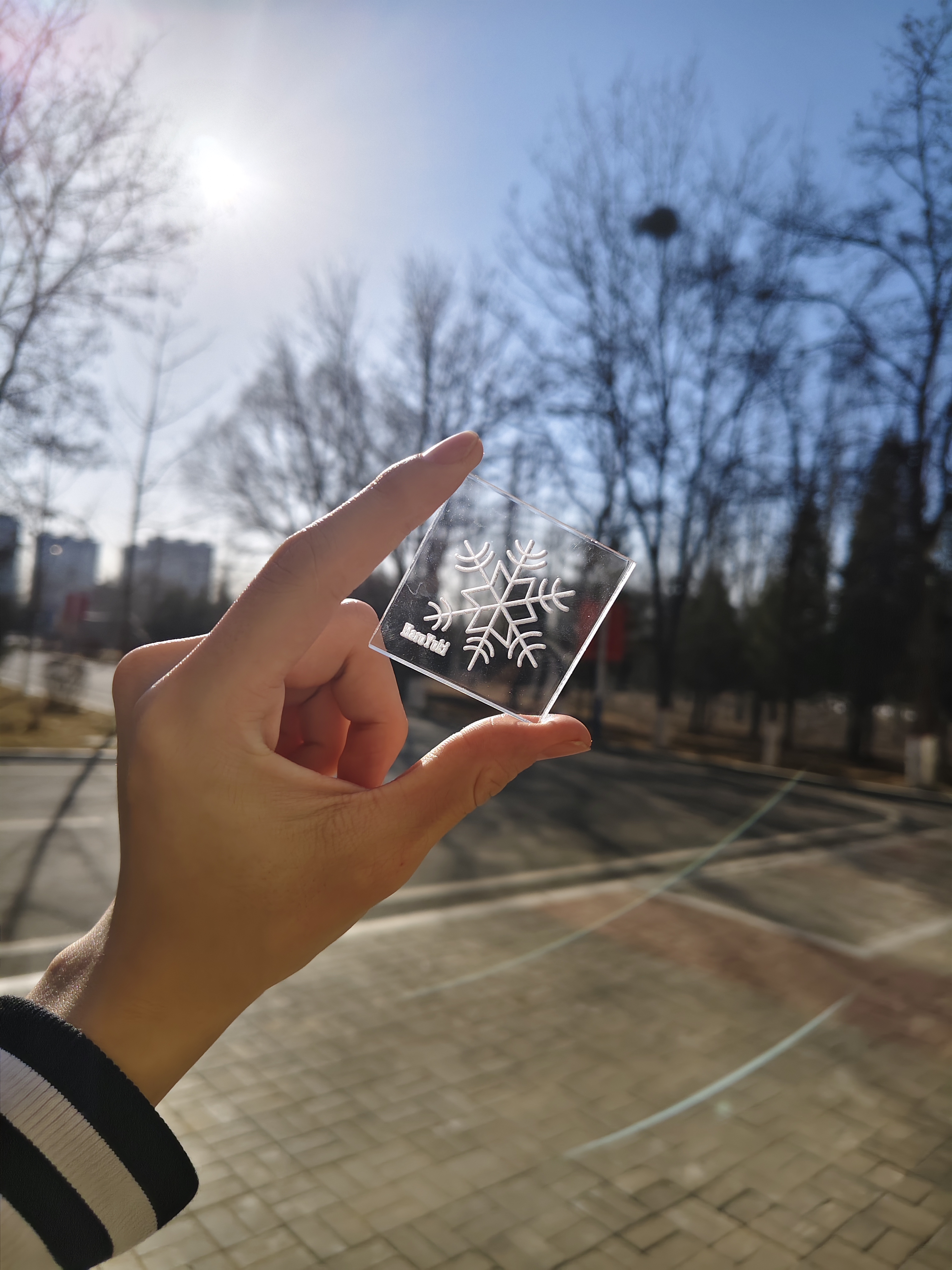 是工程实训课上用数控铣打出来的亚克力片片,感觉像是琥珀把雪花包在里面了一样,很喜欢